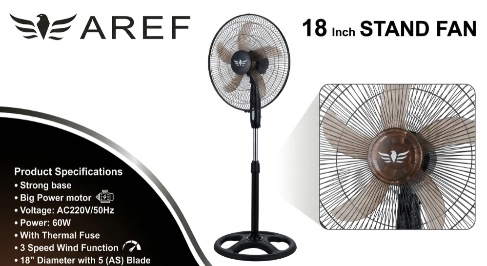 Keep your space cool and comfortable with the AREF 18-inch stand fan. Built with a powerful 60W motor and wide blade design, it delivers strong and consistent airflow. Featuring 3 speed settings, adjustable height, and a durable stable base, this fan is perfect for home, office, or commercial use.