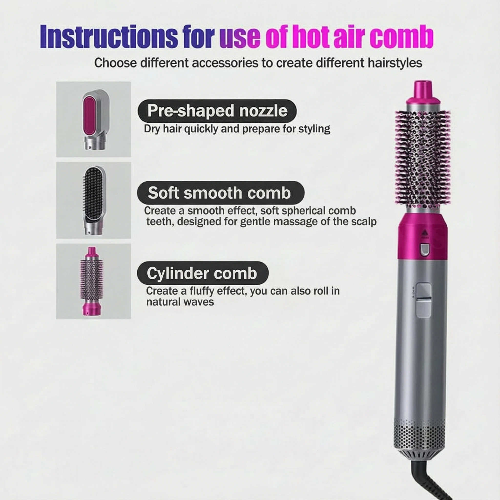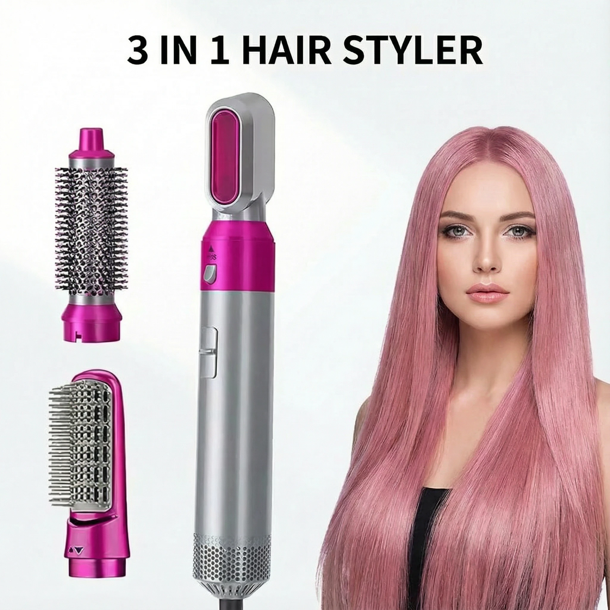 Featuring anti-static technology, it helps reduce frizz and flyaways while enhancing natural shine. The included three interchangeable attachments allow you to dry, straighten, and add volume with ease. Its lightweight and ergonomic design makes styling comfortable and quick, whether at home or on the go.