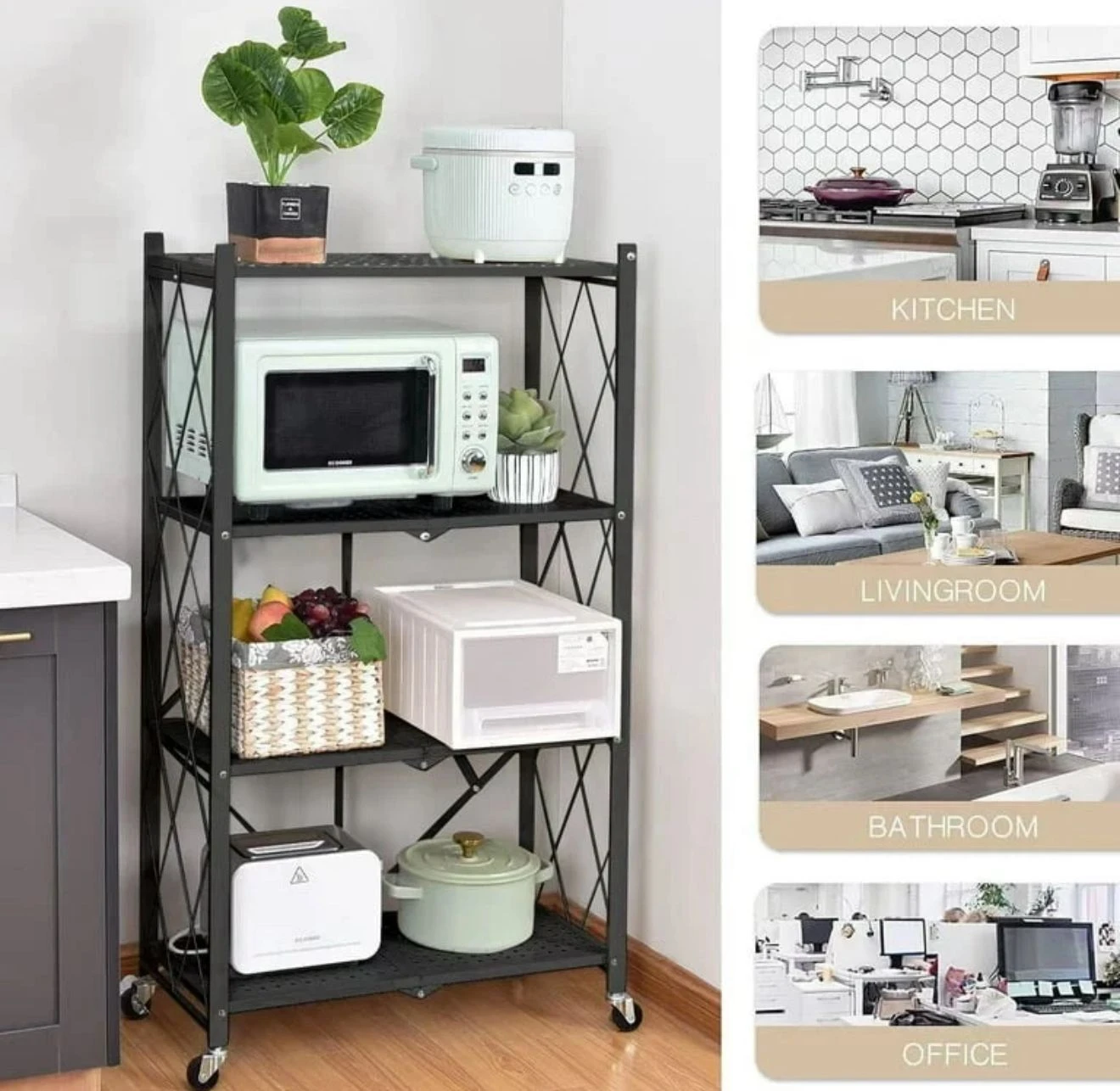 The rack features smooth-rolling wheels, making it easy to move and reposition whenever needed. Its modern, compact design fits perfectly in kitchens, living rooms, bathrooms, or offices, offering versatile storage without taking up too much space.