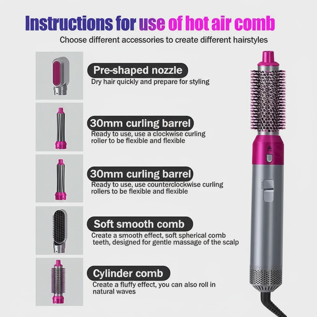 Equipped wit premium anti-static technology, it reduces frizz and flyaways, leaving your hair shiny and manageable. The styler includes five interchangeable attachments, allowing you to curl, straighten, add volume, and shape your hair effortlessly. Suitable for all hair types, it’s perfect for everyday styling or special occasions.