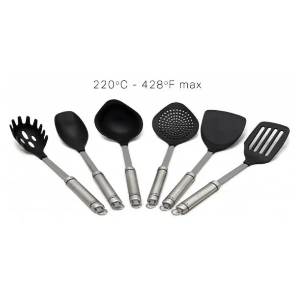 Set includes 1 slotted turner, 1 skimmer, 1 spaghetti server, 1 serving spoon ,1 Large ladle & 1 Plain?Turner.