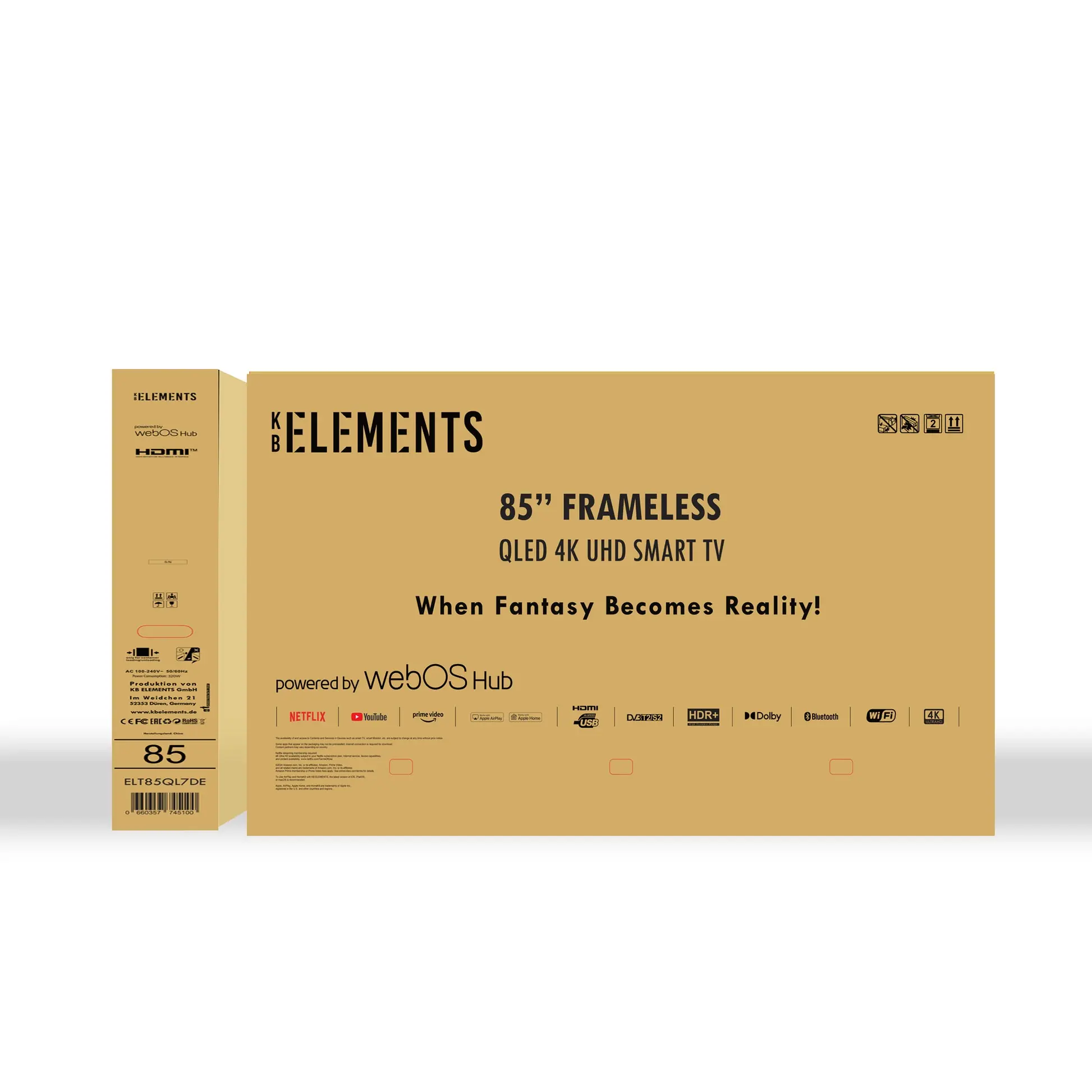 KB ELEMENTS 85" QLED TV UHD 4K SMART FRAMELESS - WebOS ULTRA HD 4K + HDR WebOS 1.5GB + 8GB 1 x Advanced Magic Remote Control with Integrated Voice Command 1 x Smart Remote Control BUILT-IN-RECEIVER: DVB-T, T2, S2, DOLBY AUDIO SYSTEM, HIFI SPEAKER 3 x HDMI, 2 x USB, OPTICAL, ANTENNA COMPONENT IN (Y-Pb-Pr) AV VIDEO IN, RCA AUDIO IN, AUDIO JACK OUT WIFI, BLUETOOTH Power Consumption ≤ 320 Watts Dimensions with feet: 189cm X 116cm X 38.5cm Dimensions without feet: 189cm X 108cm X 9cm Screen diagonal: 215cm Weight: 30.8/40.9kg 3 YEARS WARRANTY