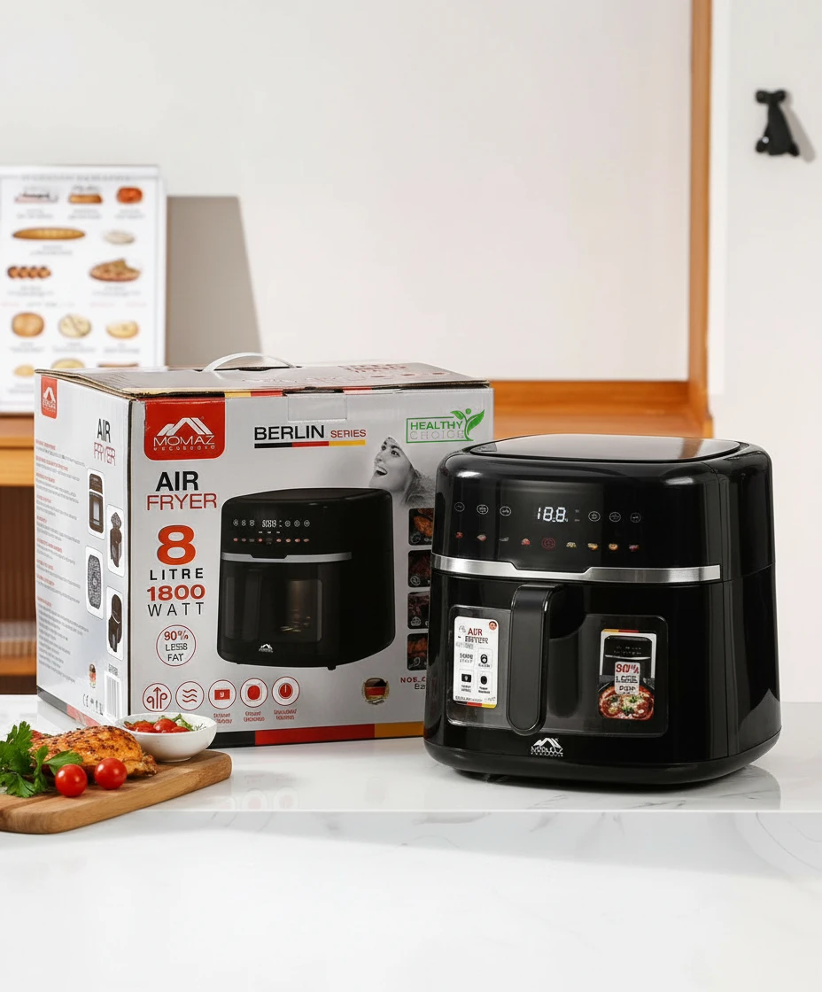 Enjoy healthier and faster cooking with the Momaz Berlin Series Air Fryer. Designed with an 8-liter large capacity and powerful 1800W performance, it’s ideal for families and everyday meals.