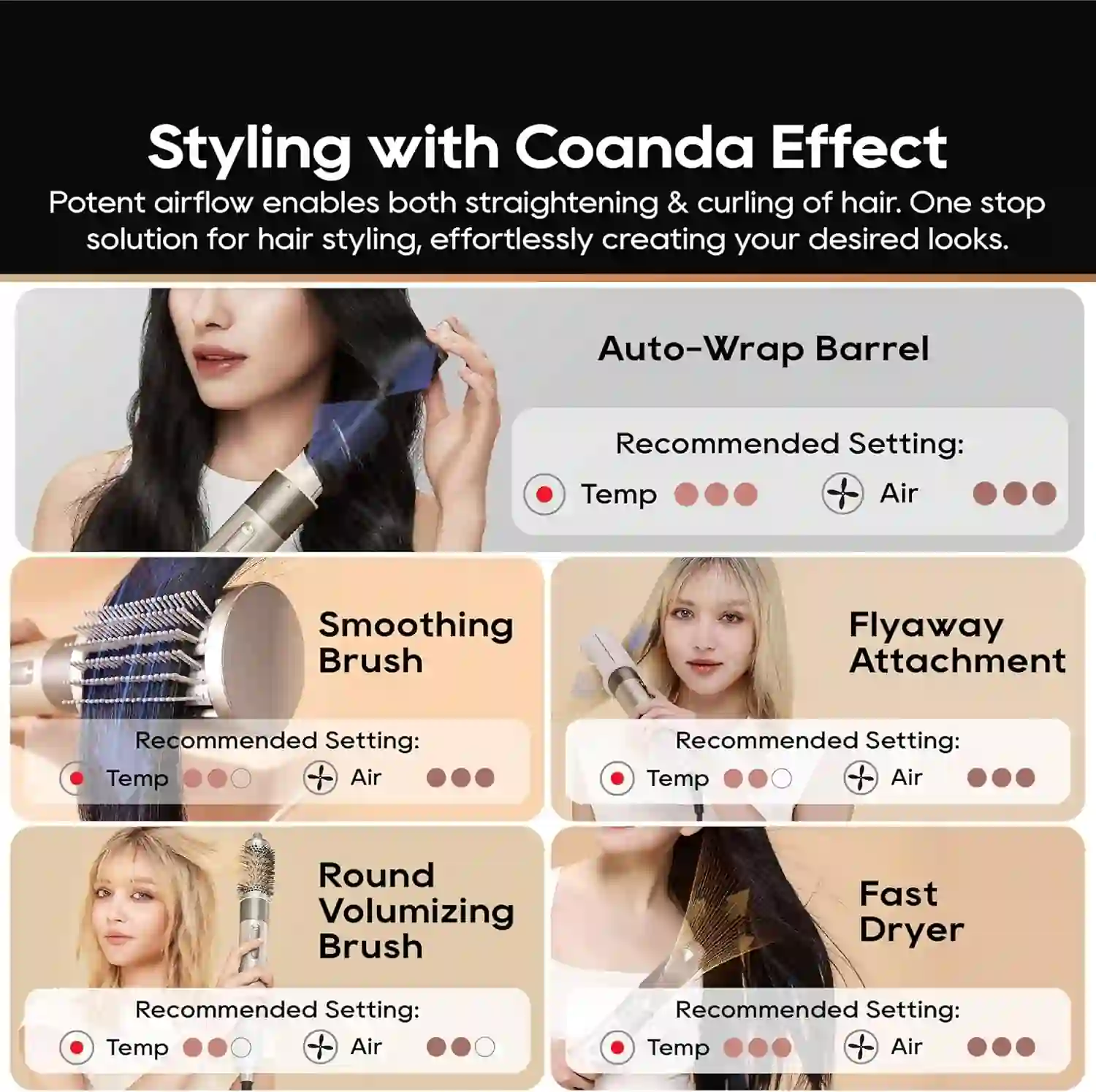 One-Stop Solution for Hair Styling: With two nozzles and three attachments - Fast Dryer, Auto-Wrap Barrel, Smoothing Brush, Round Volumizing Brush, and Flyaway Attachment- streamlines the drying and styling process.