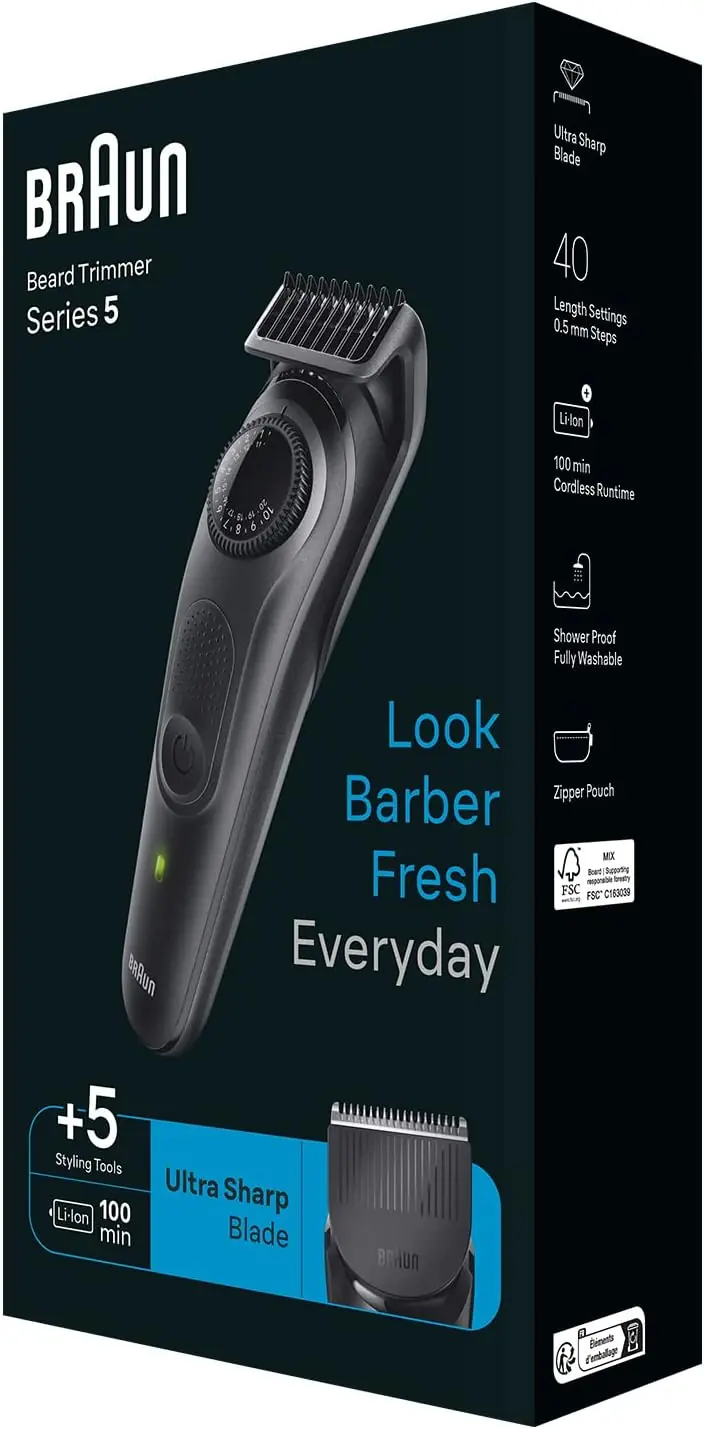 Sharper. Faster. More efficient. Braun Beard Trimmer 5 is made with a wider cutting area than any previous Braun trimmers capturing and cutting more hair in every stroke.