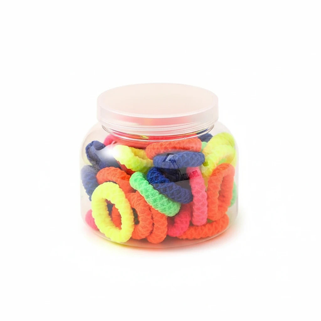 Add a pop of color to your hairstyle with this set of soft, stretchy hair bands. Available in a variety of pastel shades including pink, purple, blue, and green, these bands are perfect for securing your hair comfortably throughout the day. The convenient jar packaging ensures easy storage and access, making them a great addition to any haircare routine.