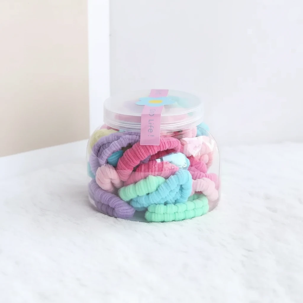 Add a pop of color to your hairstyle with this set of soft, stretchy hair bands. Available in a variety of pastel shades including pink, purple, blue, and green, these bands are perfect for securing your hair comfortably throughout the day. The convenient jar packaging ensures easy storage and access, making them a great addition to any haircare routine.
