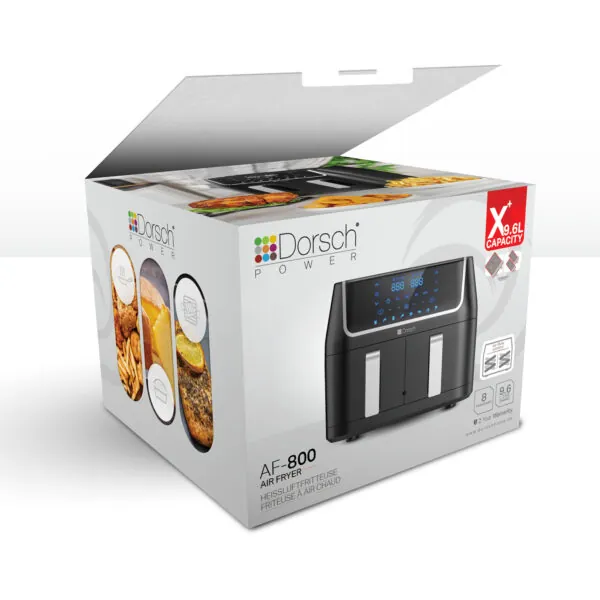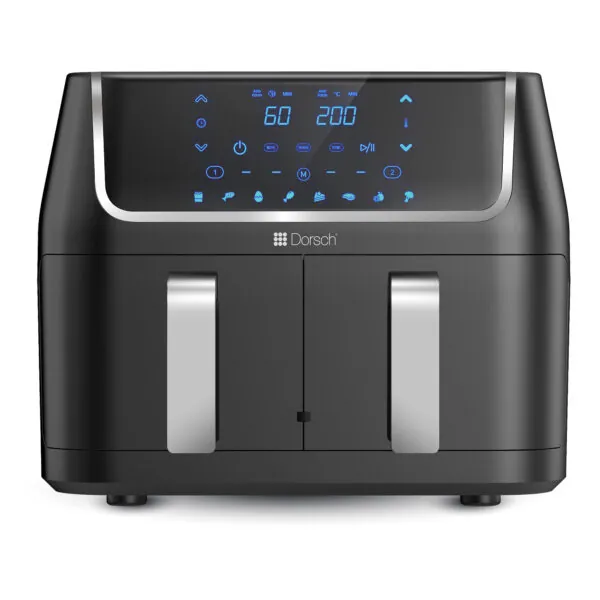 The chromic black finish and chrome-colored handles give the Dual Basket Air Fryer a sleek and stylish look that will complement any kitchen décor. The touch display with 8 preset programs makes it easy to cook your favorite foods with the touch of a button.