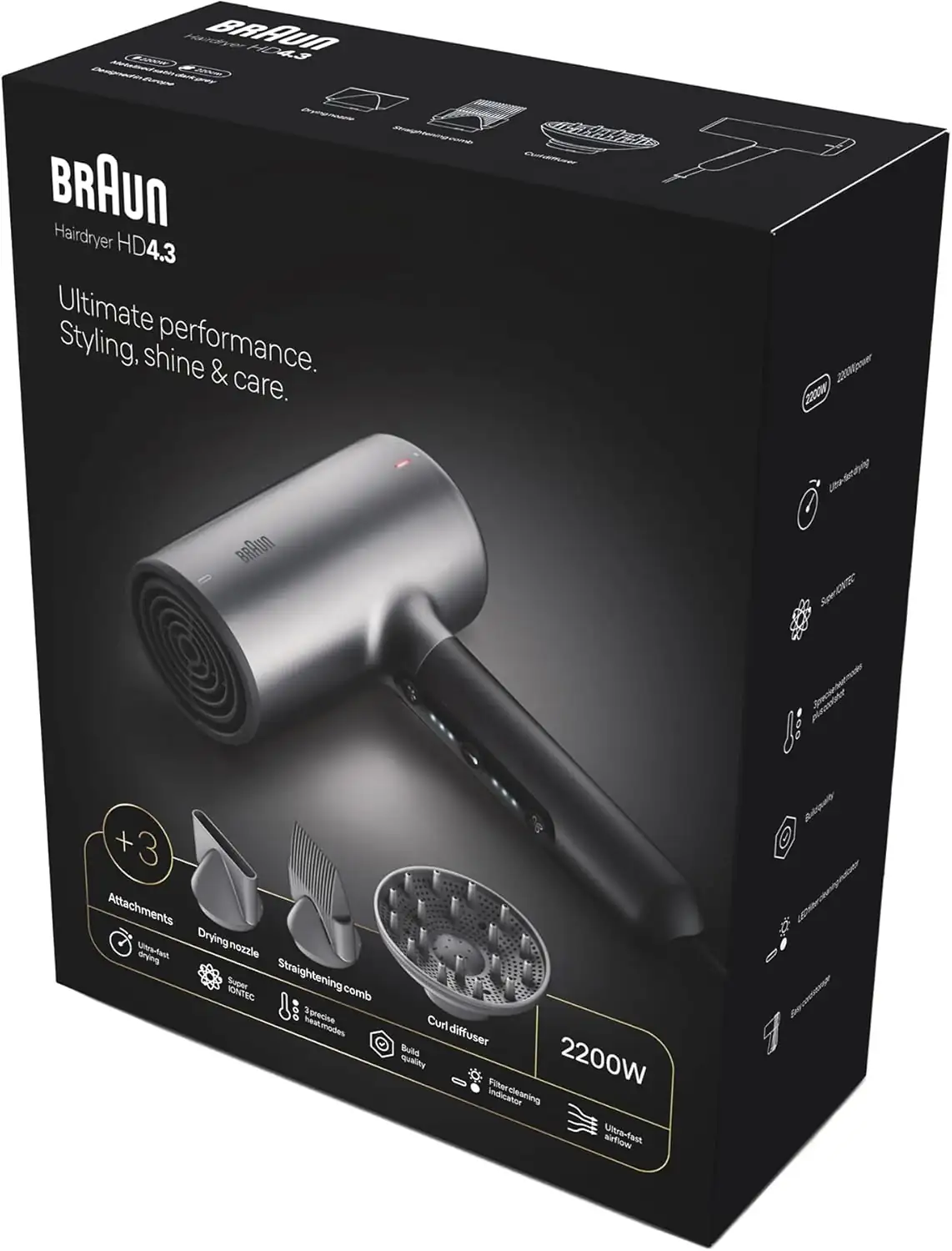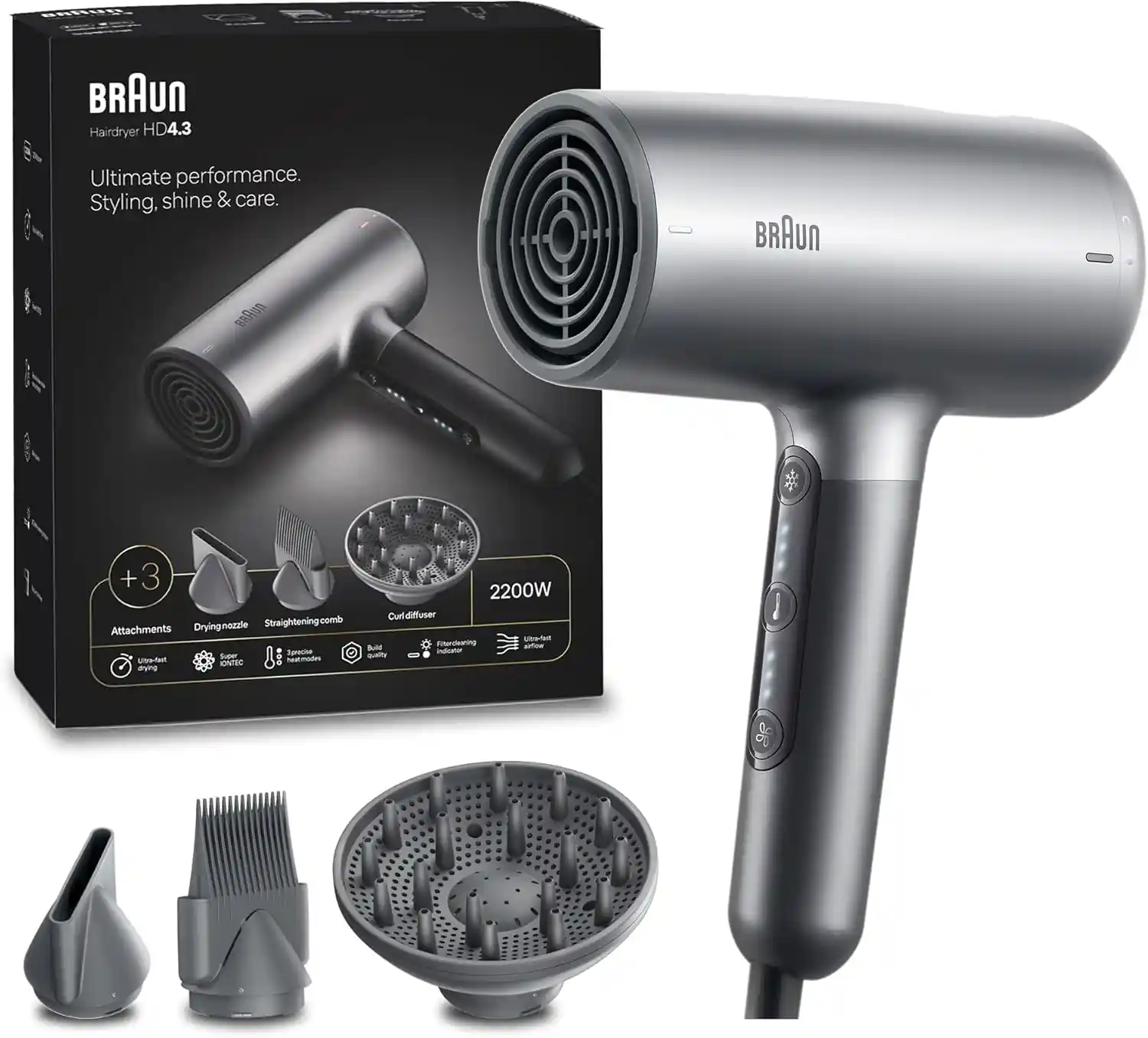 2200W Power: The Braun HD4.3 hair dryer delivers superior performance with 2200W power ensuring efficient and fast drying.