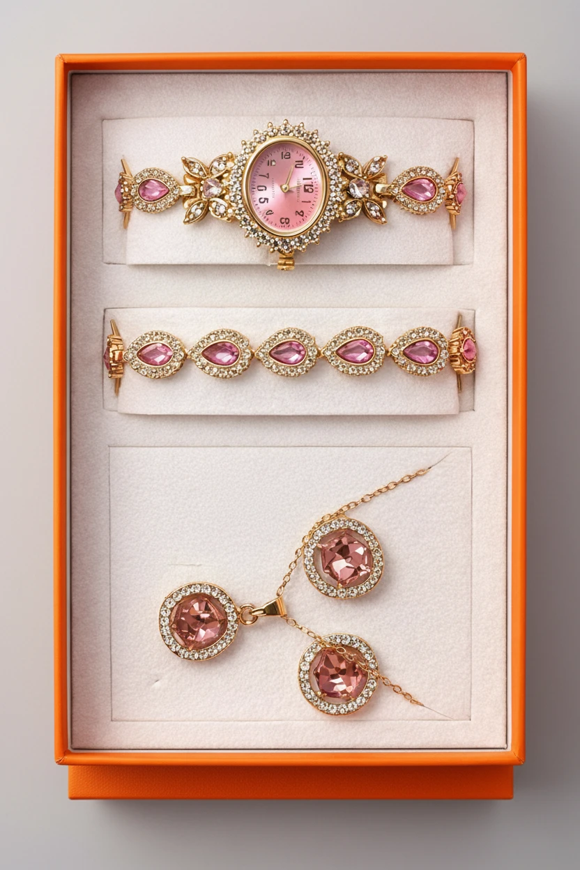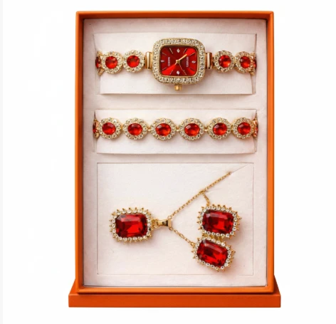 This elegant 4-piece accessory set includes a wristwatch, bracelet, earrings, and necklace, all beautifully adorned with sparkling zirconia stones and red or pink gemstones. The watch features a square dial surrounded by a delicate zirconia-encrusted frame. The bracelet, necklace, and earrings are crafted in gold-tone metal and designed with circular gemstones, offering a perfect balance of style and sophistication.