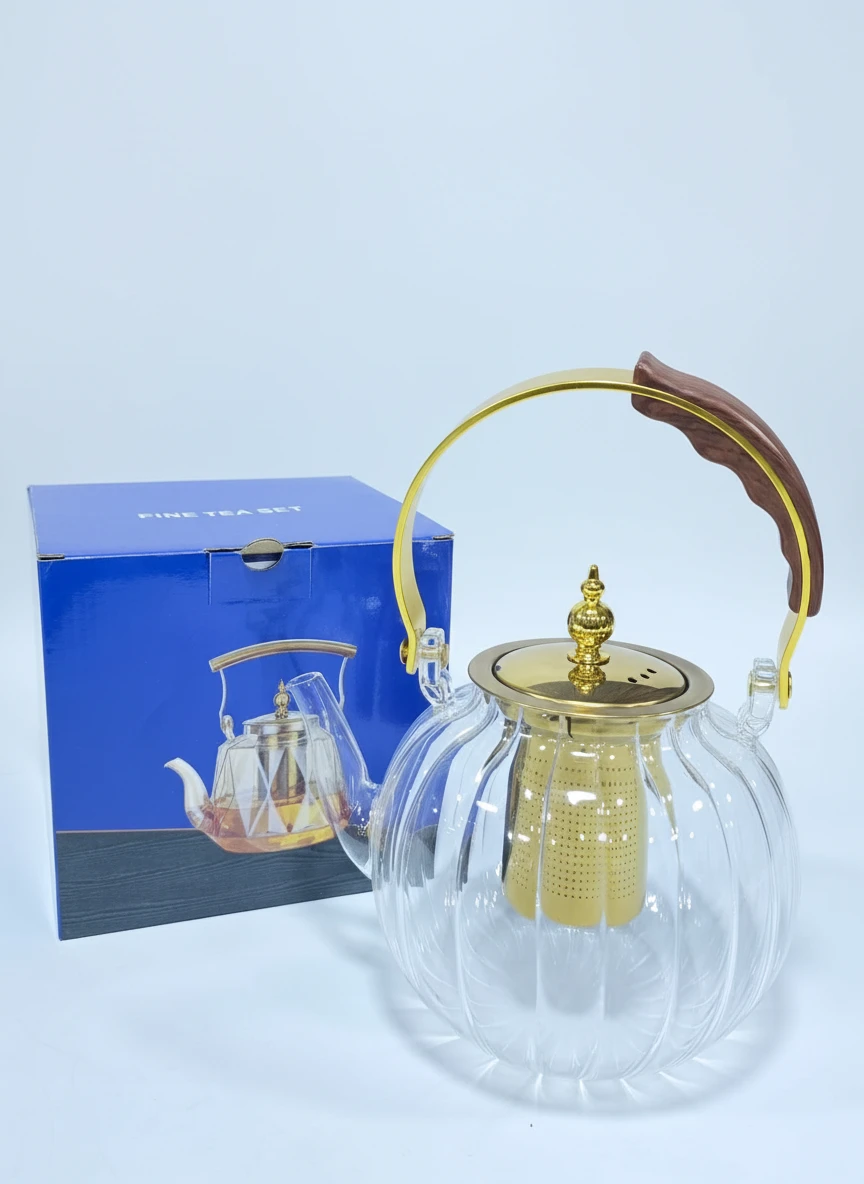 Enhance your tea experience with this elegant gass tea pot, designed with sophisticated golden accents and a stainless steel infuser. Featuring a stylish yellow handle and a unique pumpkin-shaped glass body, this pot is perfect for brewing and serving tea during special occasions or everyday moments. The infuser ensures a smooth brew for your loose-leaf tea, while the vibrant design makes it a stunning addition to your tea set collection.