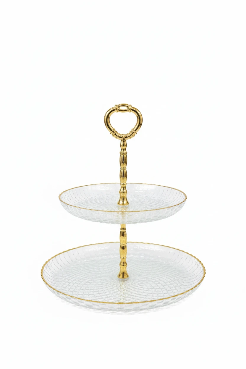 This stylish two-tier serving stand combines sophisticated design with functional elegance. Featuring beautifully crafted clear glass plates with ribbed detailing and a luxurious gold-plated handle, it is perfect for displaying desserts, appetizers, or pastries at any occasion. Whether you're hosting a tea party or showcasing your culinary creations, this serving stand adds a touch of refinement to any setting. Ideal for weddings, gatherings, or a simple afternoon tea, it brings both style and practicality to your home.