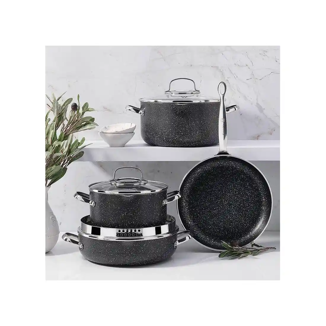 Granite Coating: The cookware features a granite coating, providing a non-stick surface for easy food release.