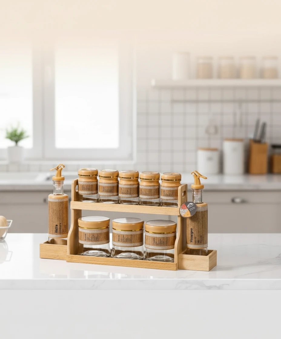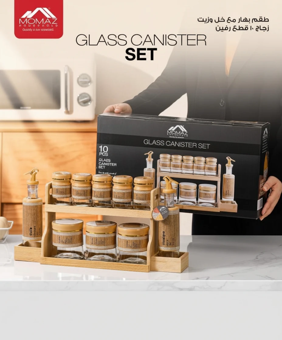 Upgrade your kitchen organization with the Momaz Glass Canister Set, combining elegant design with everyday functionality. This 10-piece set includes glass spice jars and oil bottles neatly arranged on a durable wooden stand, keeping your countertop tidy and stylish.