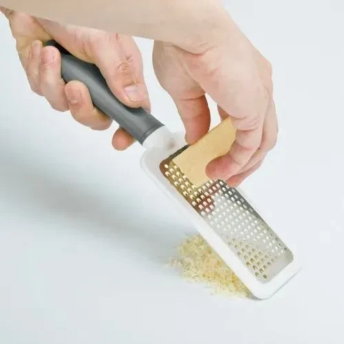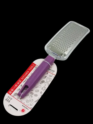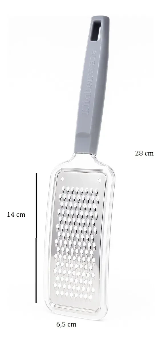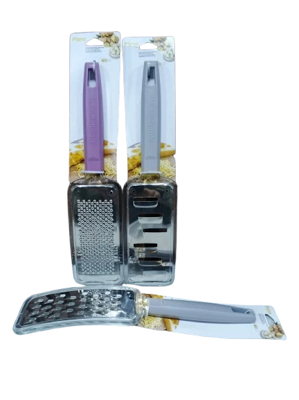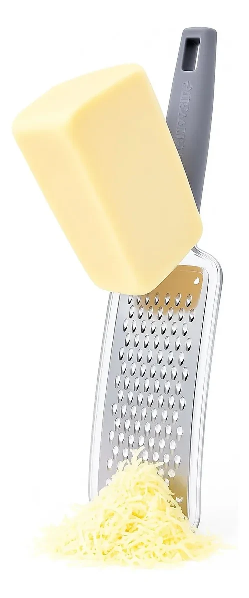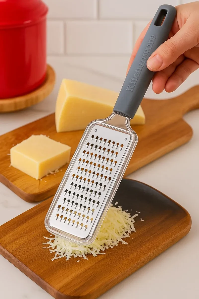 A stainless steel grater, durable and sharp, ideal for grating cheese and vegetables, with a colorful handle designed for comfort and quick cleaning, adding an aesthetic and practical touch to your kitchen