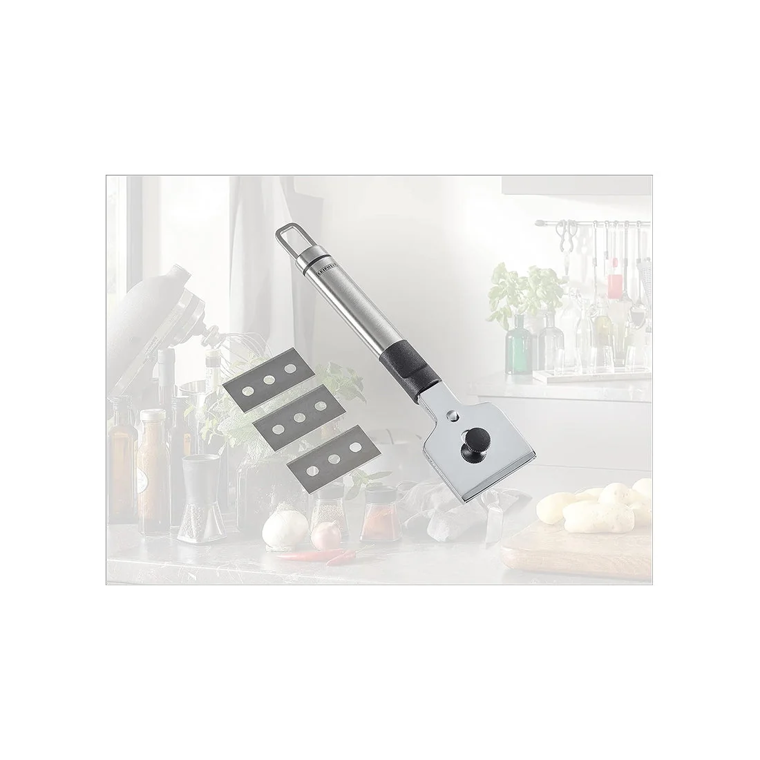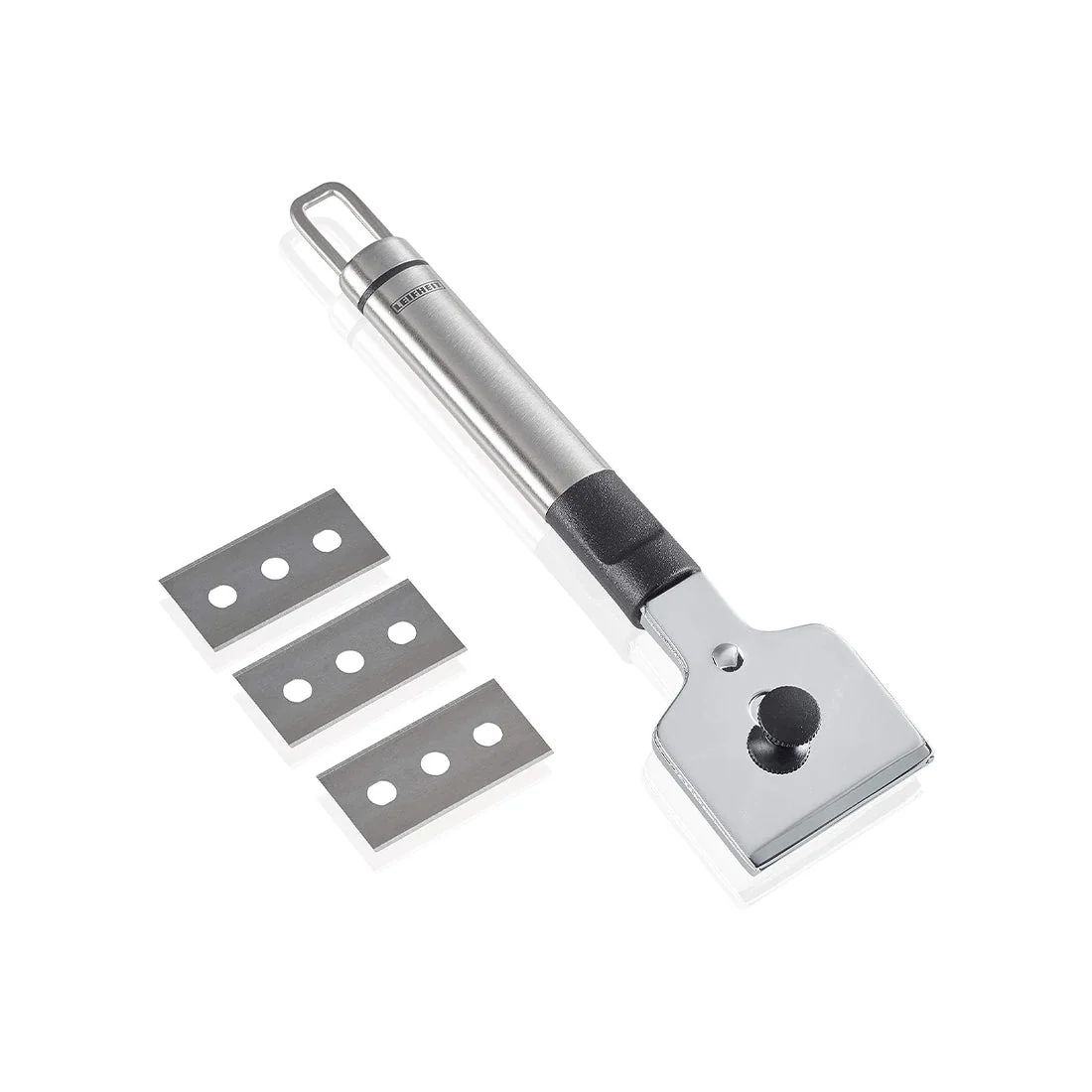 Hob scraper with spare blades and safety cover, easy blade change, by Leifheit
