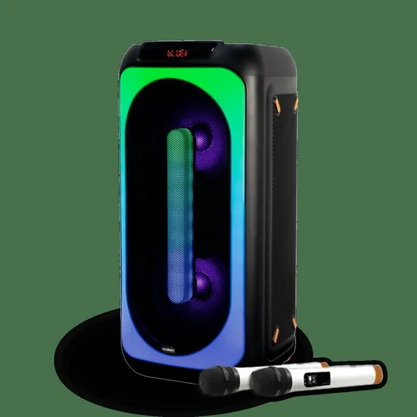 Karaoke trolley speaker with 2 wheels, dual 8" subwoofers, wireless mics