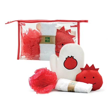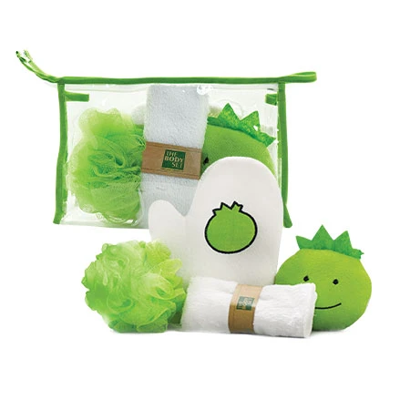 A lovely bath kit containing: 1- glove-shaped scrubber 2- mesh bath sponge 3- soft towel 4- round sponge.