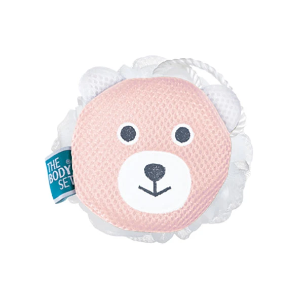 A bear-shaped bath sponge for kids made of fiber and polyethylene. Hot water resistant & washing machine safe.