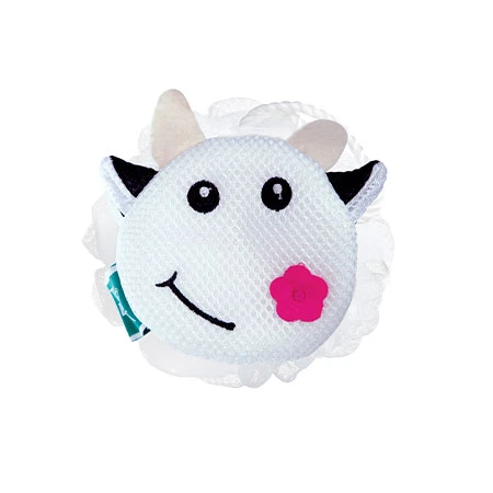 A cow-shaped bath sponge for kids made of fiber and polyethylene.