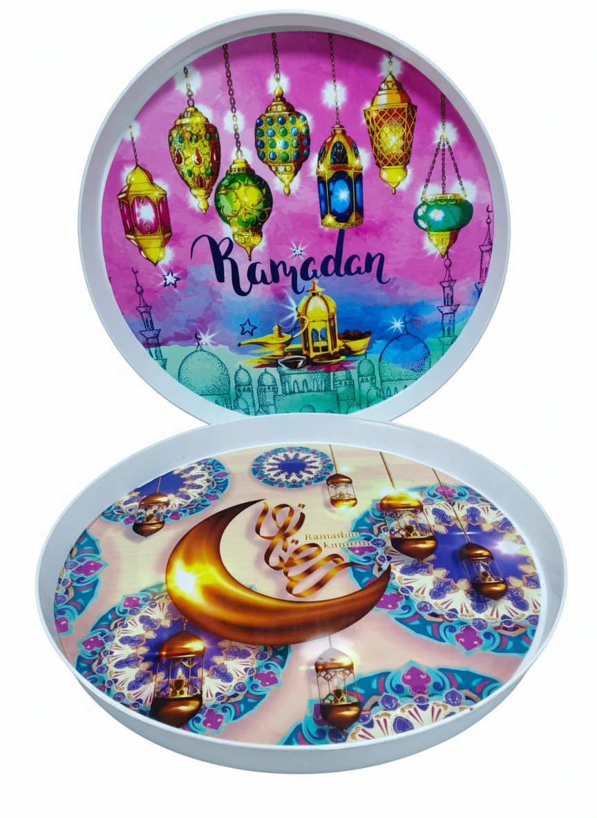 Make a bold statement in your seasonal décor with this elegant large round decorative serving tray (60 cm). Designed with vibrant Ramadan-themed artwork featuring colorful lanterns, crescent moon details, and festive patterns, this tray adds warmth and elegance to any space.