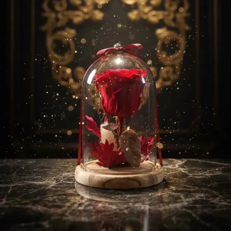 Nestled beneath a crystal-clear glass dome and resting on an elegant wooden base, the rose is delicately surrounded by romantic botanical accents, creating a scene straight out of a love story. Finished with a satin ribbon, every detail is designed to feel intimate, refined, and unforgettable.