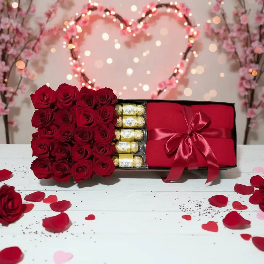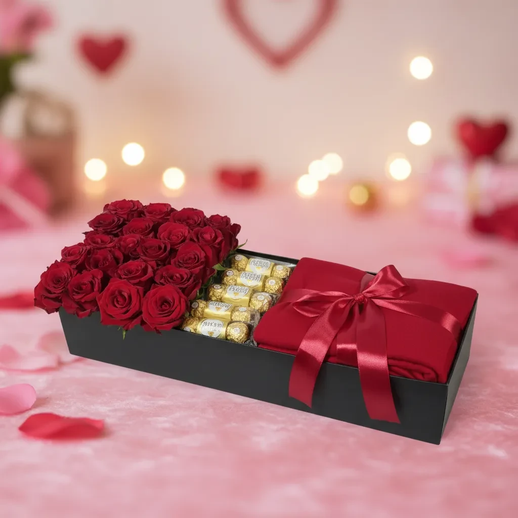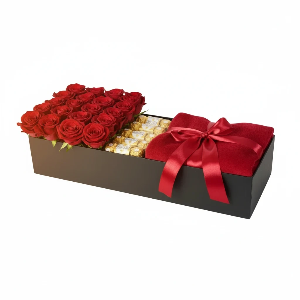 Paired perfectly with the flowers are 15 Ferrero Rocher chocolate balls, offering a rich blend of roasted hazelnuts, creamy chocolate, and golden crunch—an irresistible touch of luxury. The arrangement is completed with a soft red foulard, adding an extra layer of sophistication and keepsake charm.