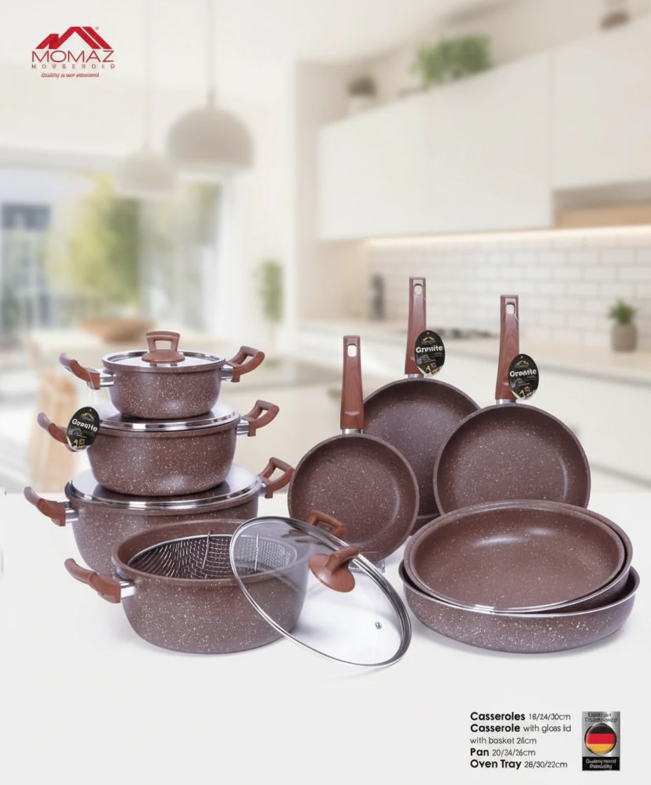 Cook with confidence using the Momaz German Granite Cookware Set (15 Pieces), crafted with German technology to deliver durability, performance, and healthy cooking. The premium granite non-stick coating ensures excellent heat distribution, less oil usage, and easy cleaning.