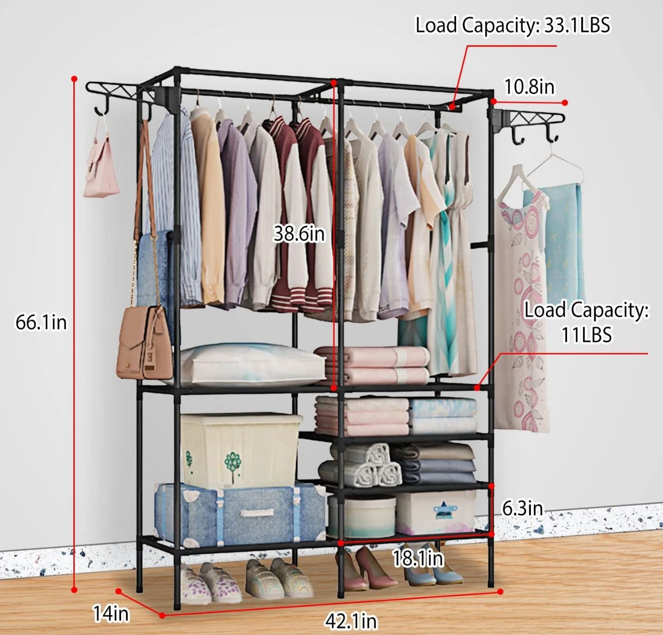 Perfect for bedrooms, dressing rooms, or laundry areas, it offers ample space for clothes, shoes, bags, blankets, and storage boxes. Its open design allows easy access while keeping everything visible and tidy.