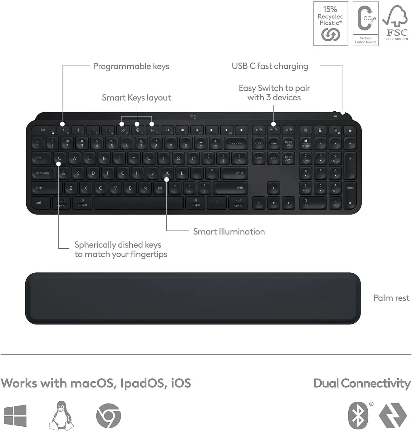 Multi-Device, Multi OS Combo: Pair with up to 3 devices on nearly any operating system (Windows, macOS, Linux) via Bluetooth Low Energy or included Logi Bolt USB receiver (5)