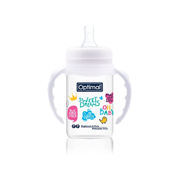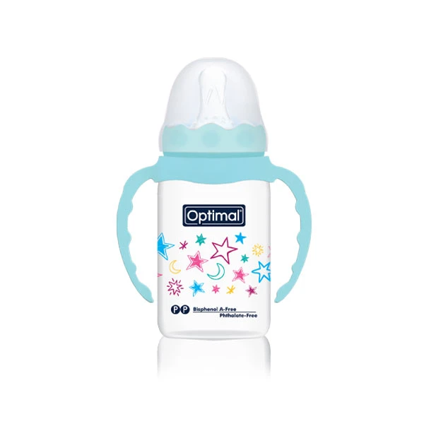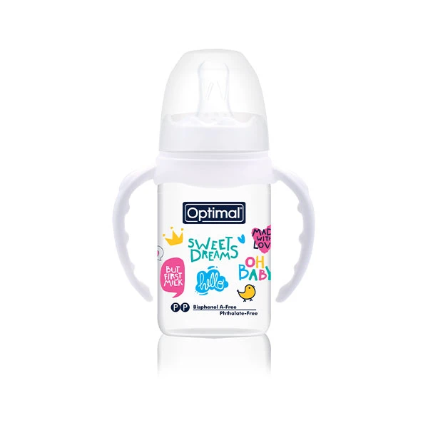 A non-toxic feeding bottle (0m+) with a round nipple and a narrow neck. Equipped with handles. Dishwasher-safe/ Sterilizer-safe.