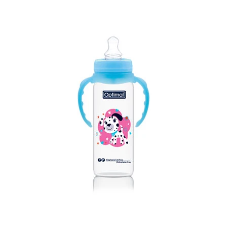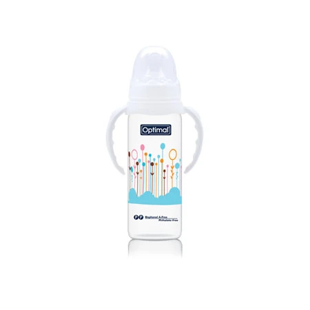 A non-toxic feeding bottle (6m+) with an orthodontic nipple and a narrow neck.