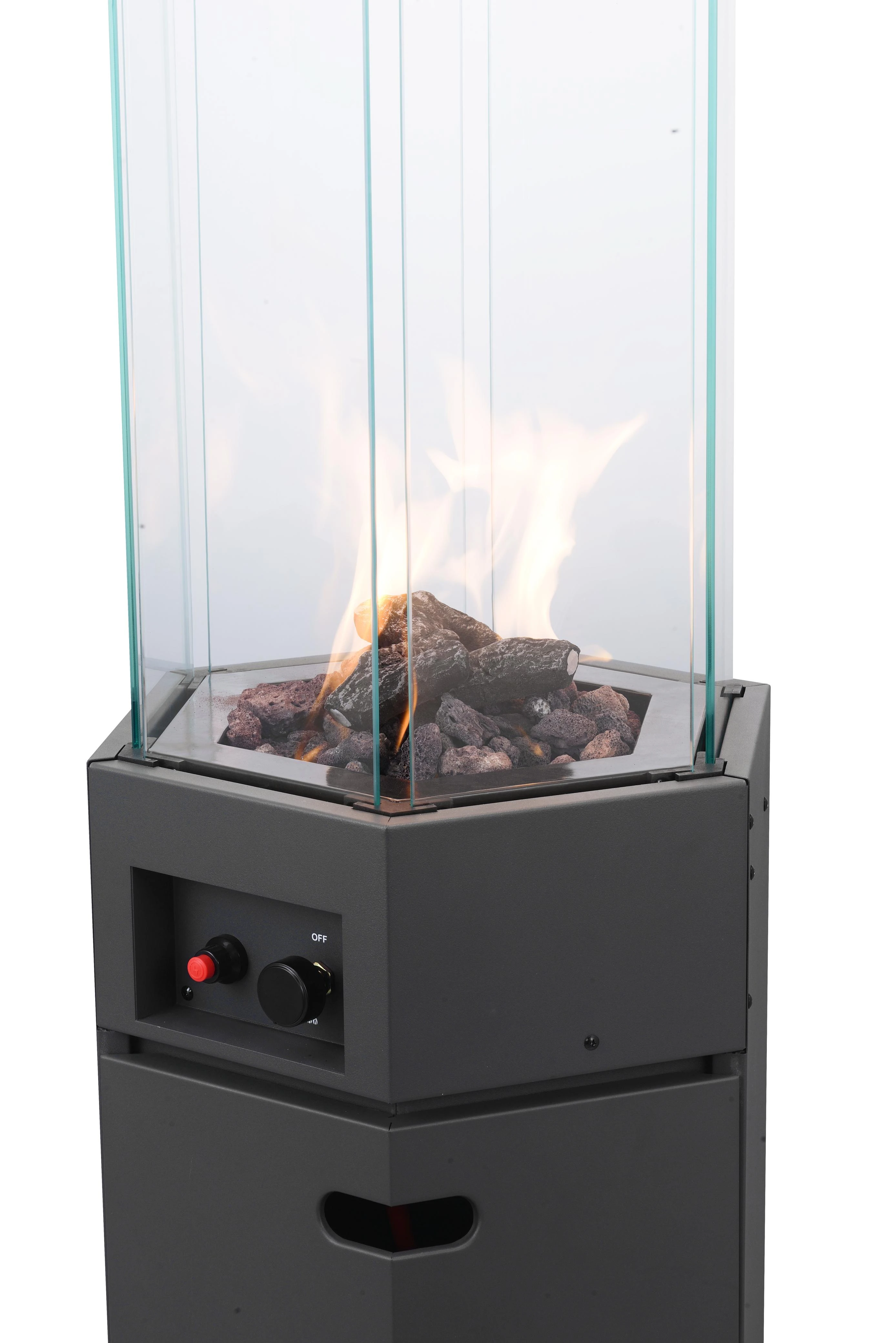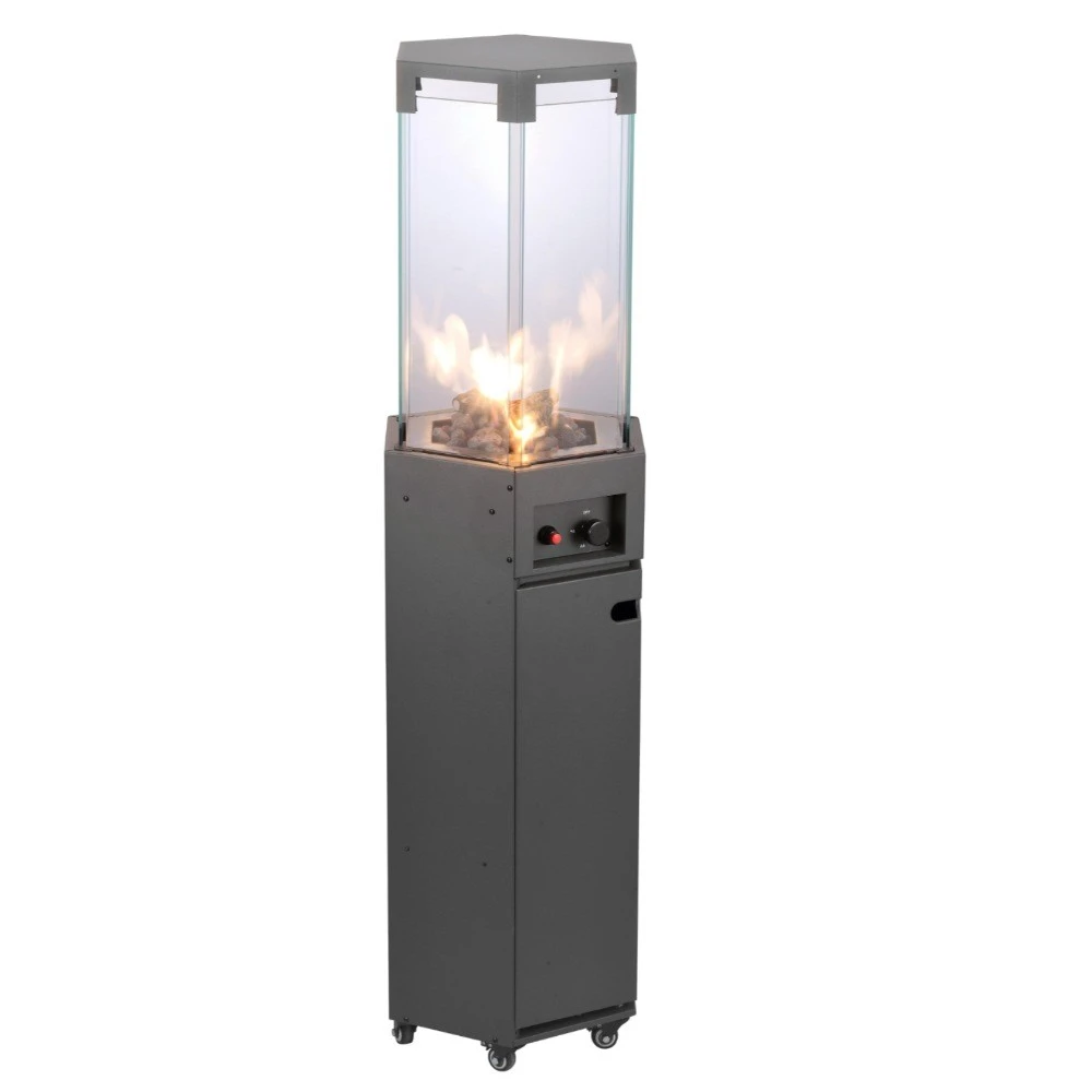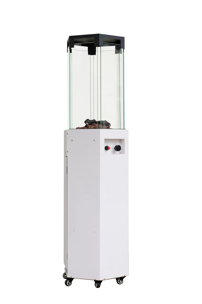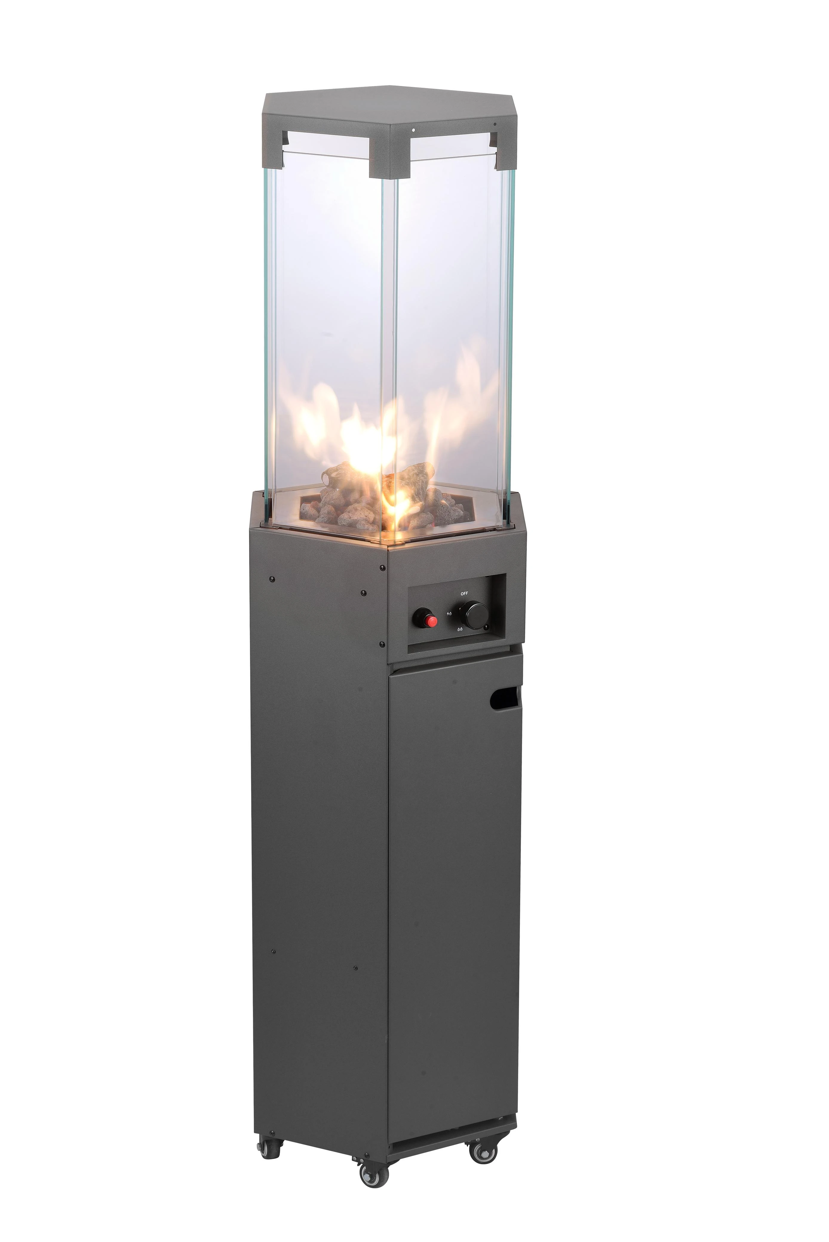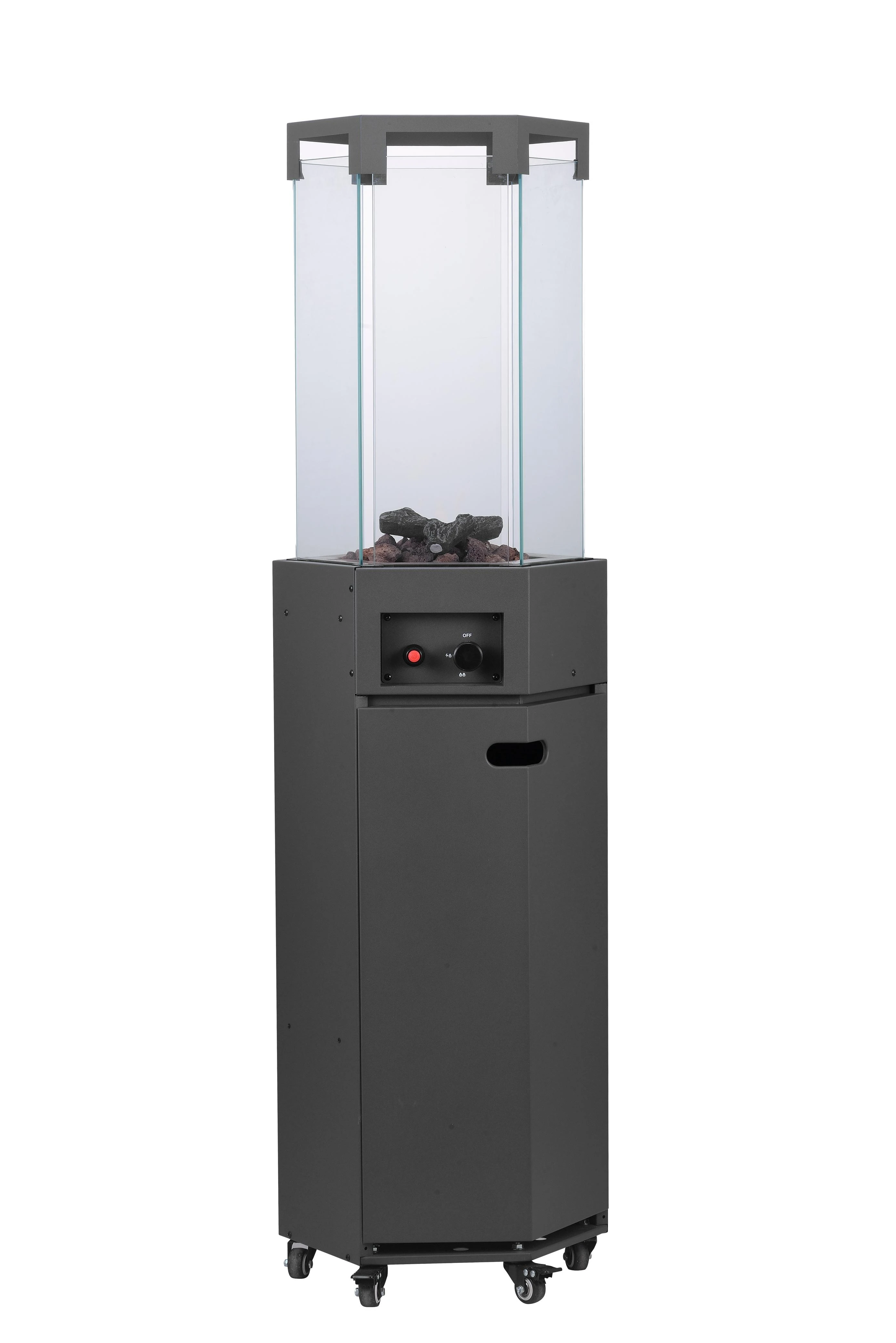 Patio gaz heater, WITH LAVA ROCK, WITH FAKE WOOD, SIX-SIDE TEMPERED TOP GLASS, WITH 6 WHEELS, SIZE: 145CM
