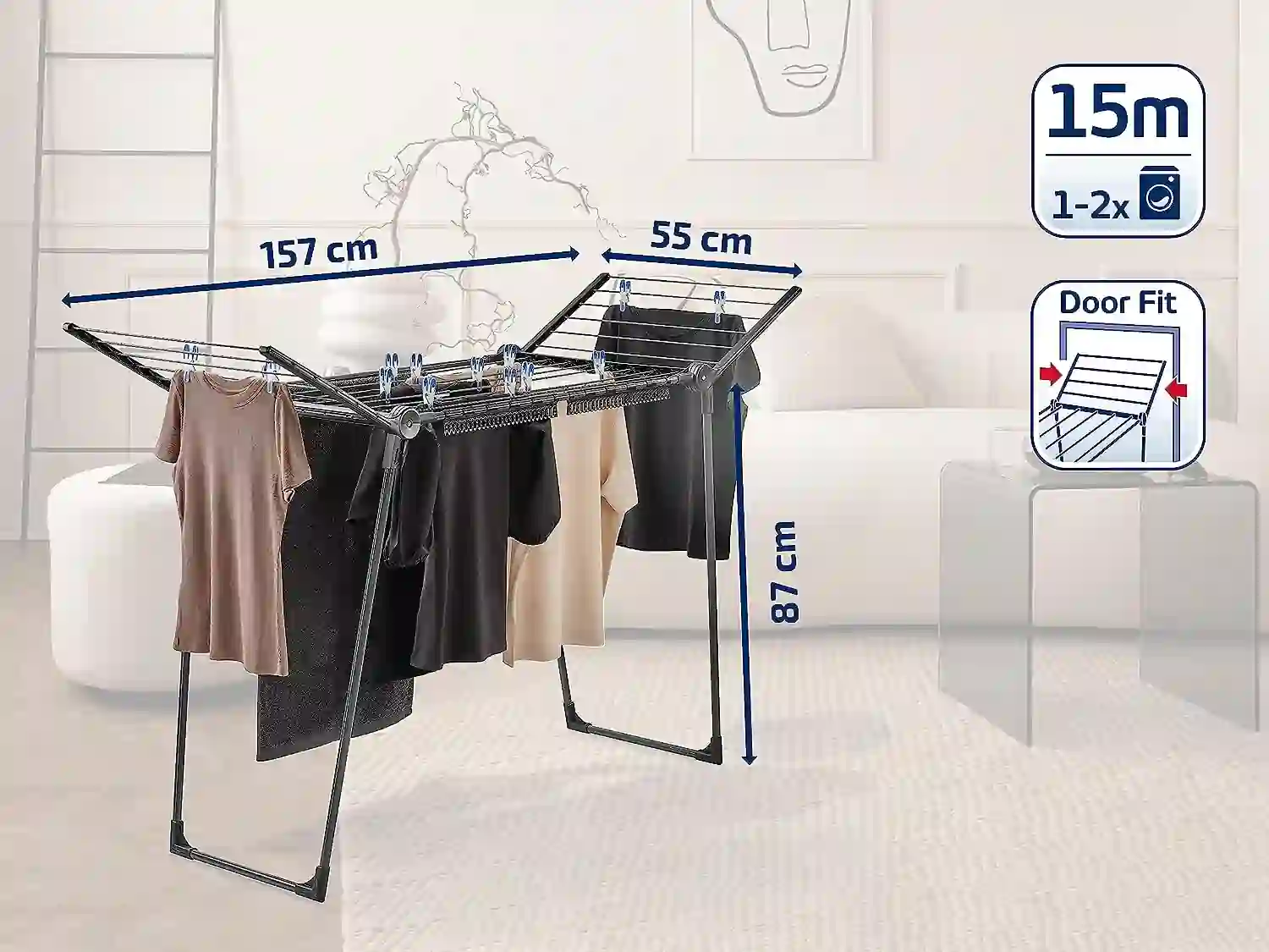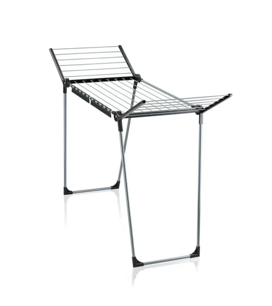With the wings, this flat stowable laundry rack is ideal for drying long laundry.