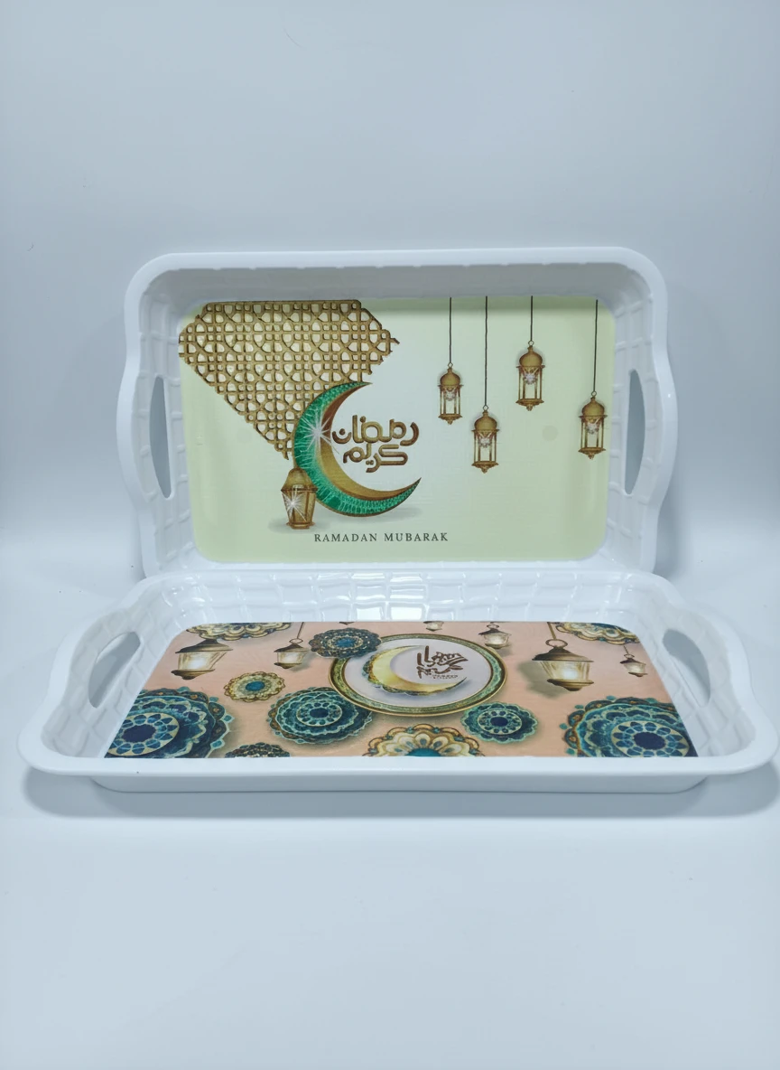 Add elegance and practicality to your seasonal setup with this rectangular decorative serving tray (53 × 35 cm). Designed with beautiful Ramadan-themed prints featuring crescent moons, lanterns, and geometric patterns, this tray brings a warm and festive touch to your home.