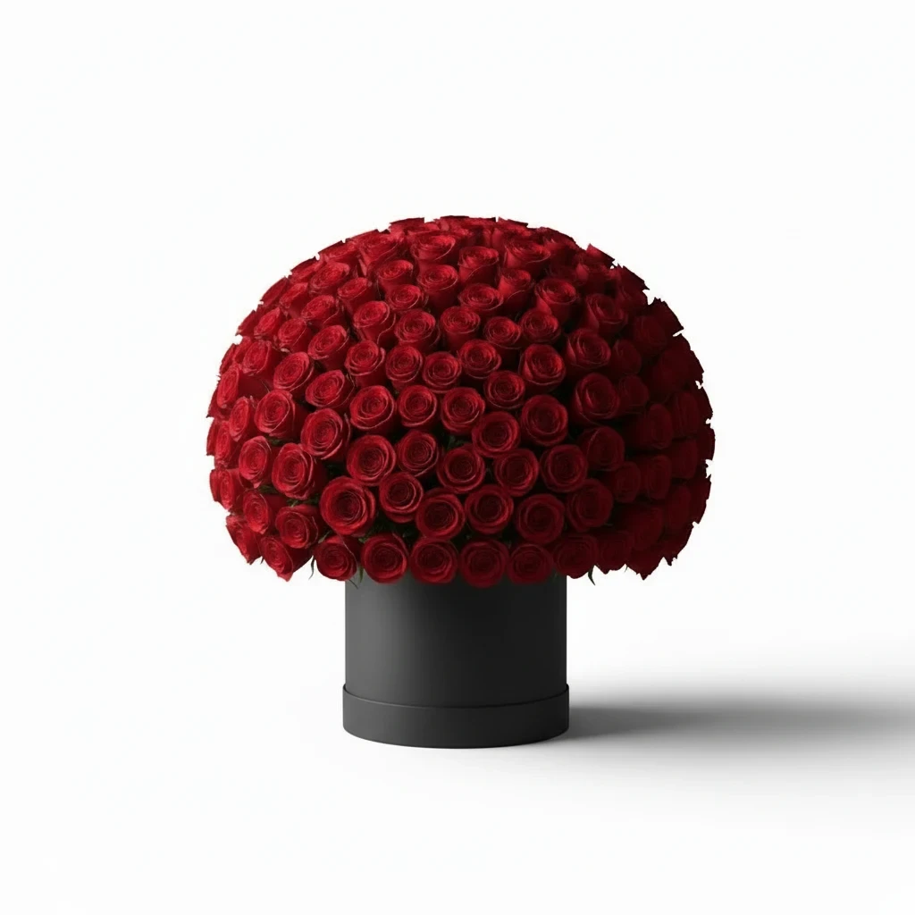 Grown in Ecuador’s renowned rose fields, each rose is hand-selected for its deep red color, exceptional bloom size, and velvety texture. The roses are meticulously arranged into a perfectly rounded composition and presented in a sleek black cylinder vase, creating a modern yet timeless centerpiece.