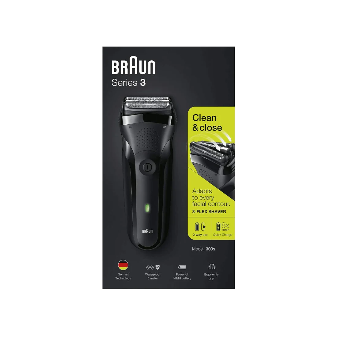 Braun Series 3 S300 is designed with 3 flexible blades that move with every facial contour for maximum skin contact and efficiency in one stroke. Tough on Beards, Smooth on Skin: The Braun Series 3 rechargeable electric foil shaver delivers a robust performance for effective beard trimming while ensuring smooth and comfortable skin contact.