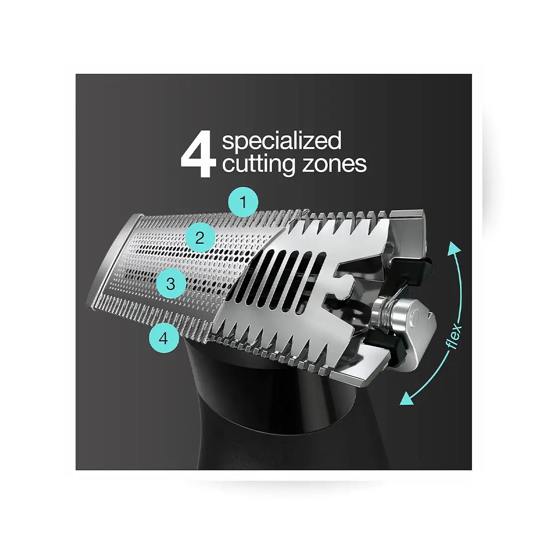 One blade with 4 cutting elements, consisting of 2 side trimmers and 2 central shaving zones.