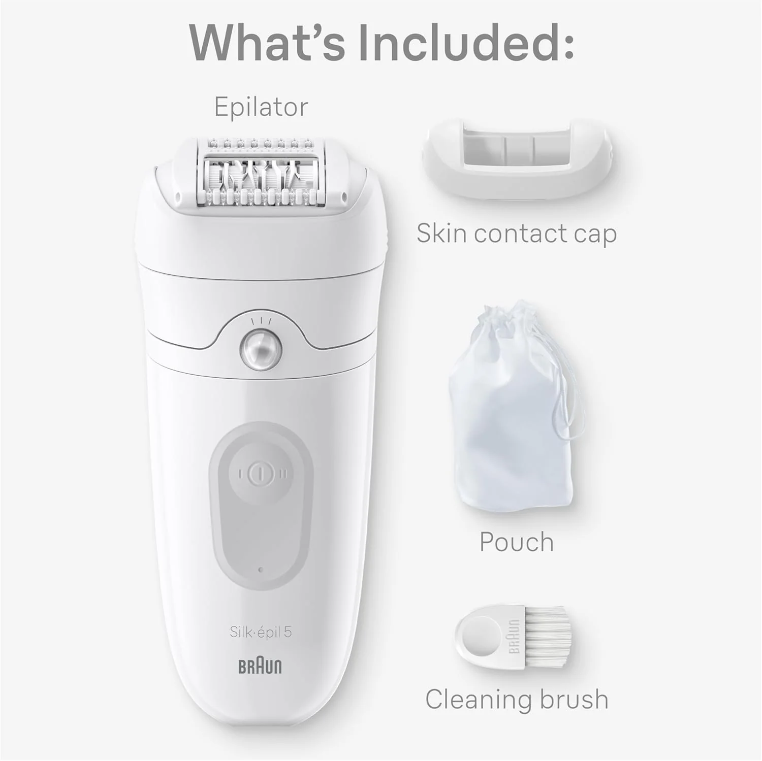 INCLUDES: SE5 Epilator, Bikini trimmer and attachments, Trimmer comb, Shaver head, cleaning brush and Pouch