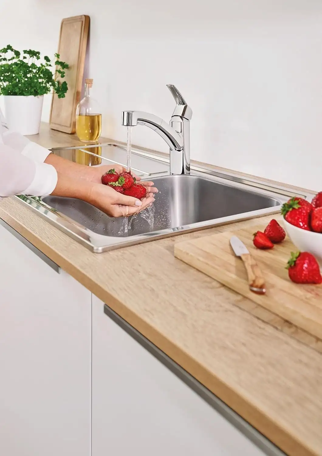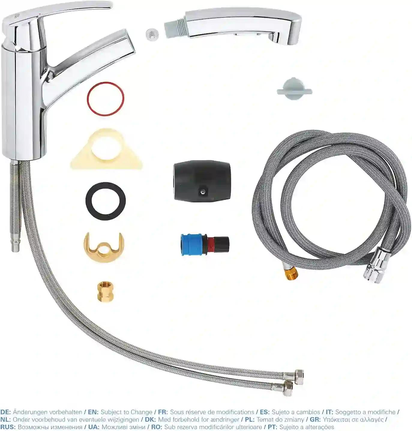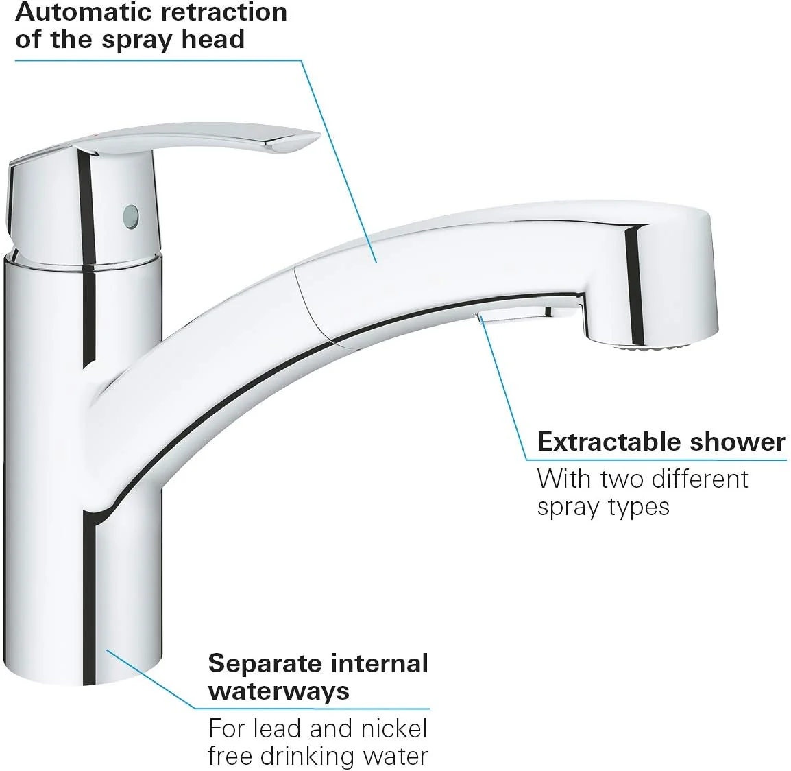 GROHE Zero isolated inner water ways - lead and nickel free pull-out dual spray control - switching between regular flow and spray diverter: laminar spray/SpeedClean shower jet automatic return to laminar spray rapid installation system protected against backflow