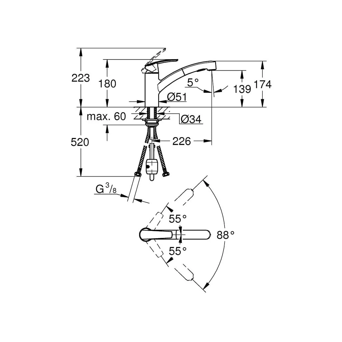 GROHE SilkMove 35 mm ceramic cartridge with integrated temperature limiter adjustable flow rate limiter swivel tubular spout swivel area 90°