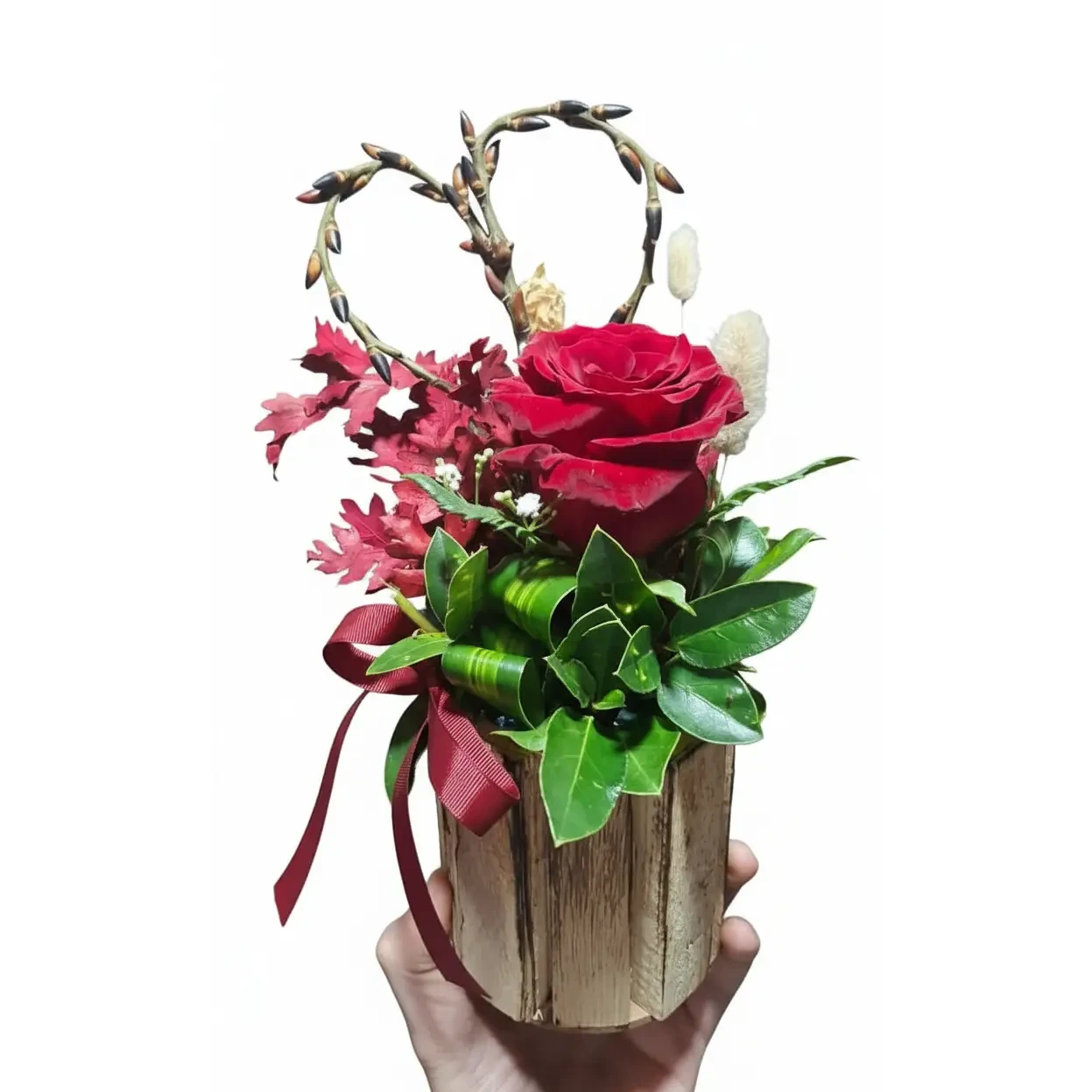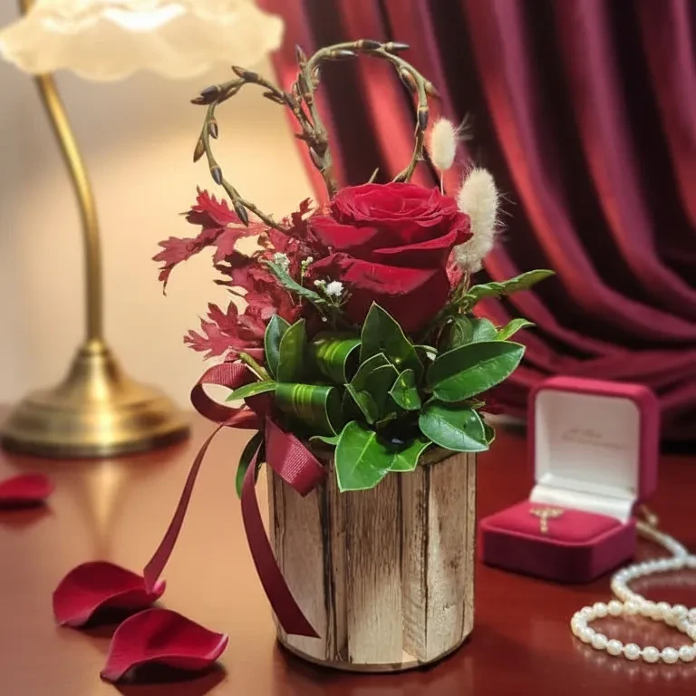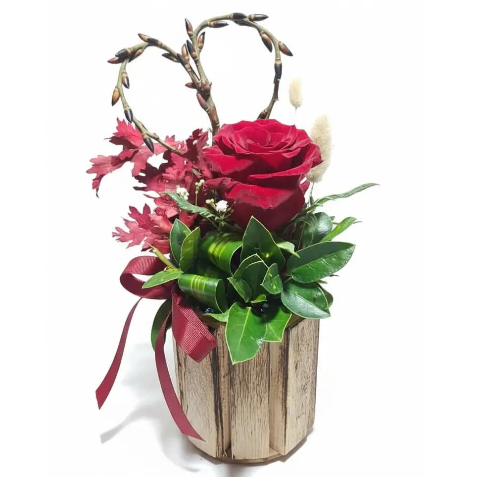 Artfully arranged in a rustic wooden box, the rose is surrounded by lush greenery and romantic botanical accents, forming an elegant heart-shaped design that symbolizes eternal love and deep connection. Finished with a satin ribbon, every detail reflects warmth, intimacy, and refined luxury.