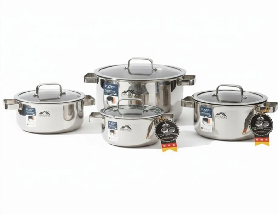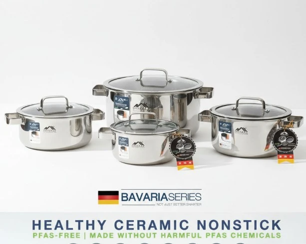 The cookware features a healthy ceramic nonstick coating, completely PFAS-free, with no PTFE or PFOA, making it safe for everyday cooking. Each pot comes with a heat-resistant glass lid and sturdy stainless steel handles for comfortable handling.