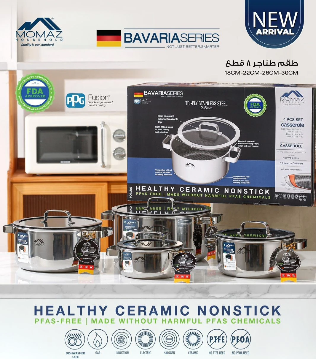Cook with confidence using the Momaz Bavaria Series Ceramic Nonstick Cookware Set, designed for healthy, durable, and efficient cooking. This 8-piece casserole set is made from tri-ply stainless steel (2.5mm thickness) for fast and even heat distribution.