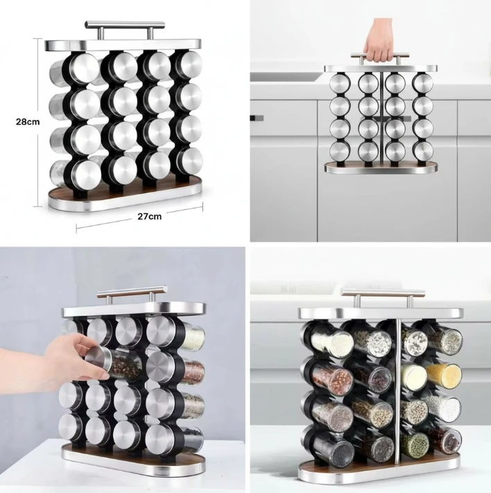 The perforated lids allow for easy and precise seasoning while keeping spices fresh. The open design ensures quick access, and the top handle makes it easy to carry and move.