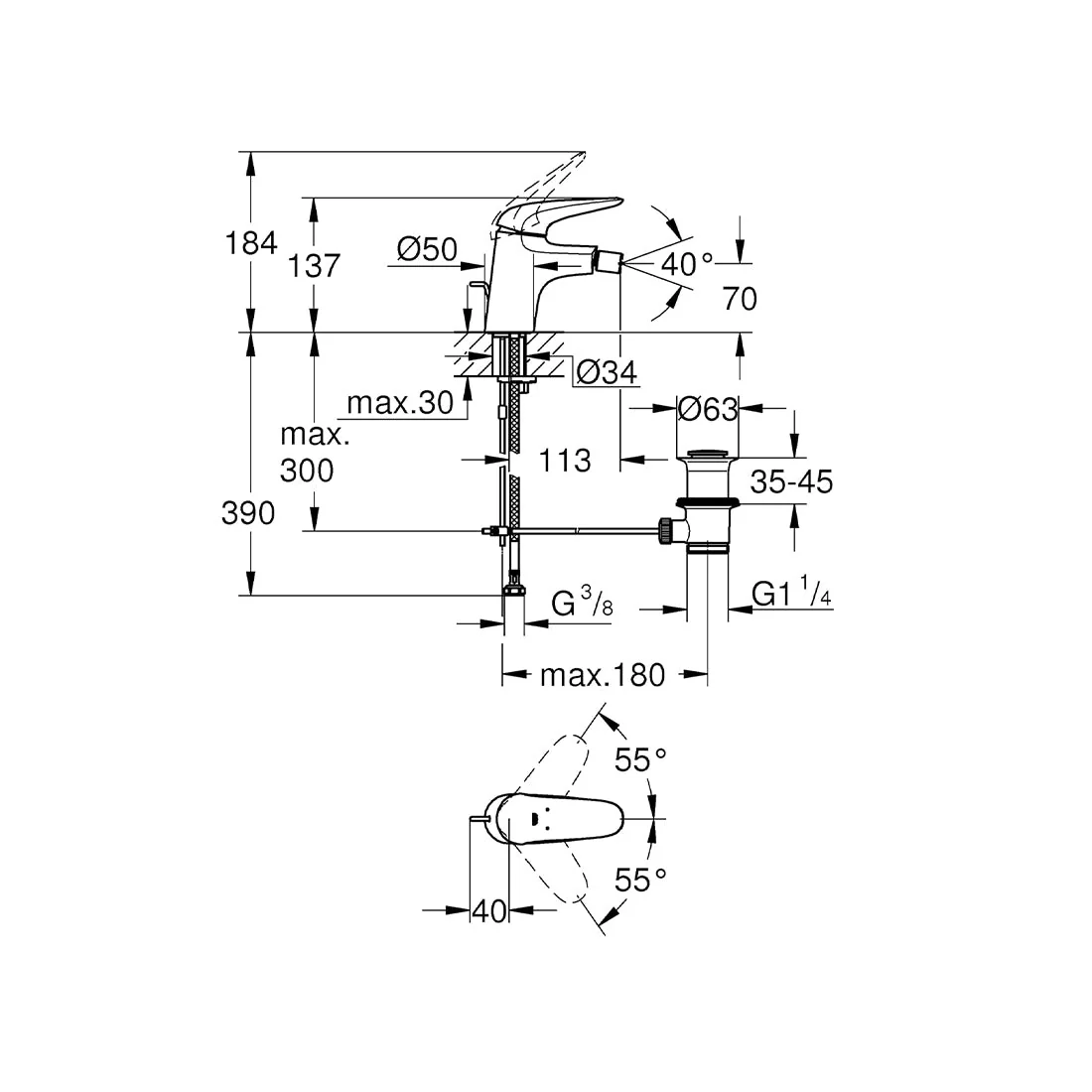 Wave OHM single hole bidet mixer with pop-up waste, chrome, Grohe